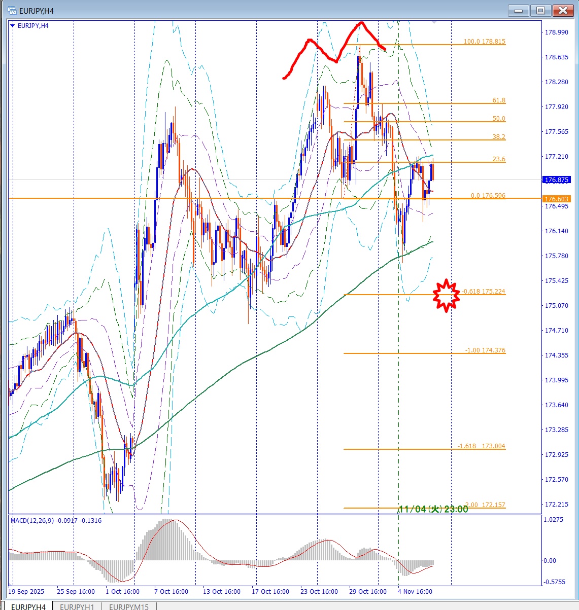 4hレベルでwトップ下抜けして、大きくは下げ方向。(wトップネックラインから-0.618メド)