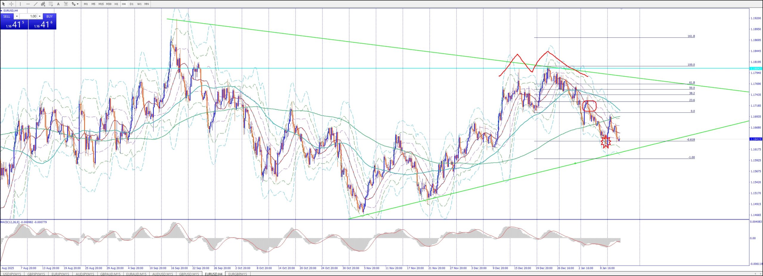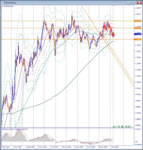 年明けで、4h・1h揃って下げ。ブレイクで入れるかは時間帯次第か。