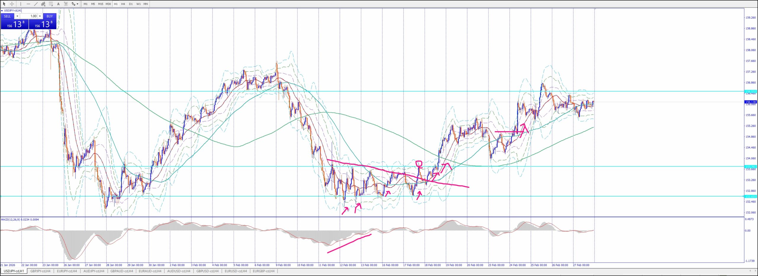 ベースは、日足・4hで方向決まってる相場で、1hの押し戻りから入る感じ