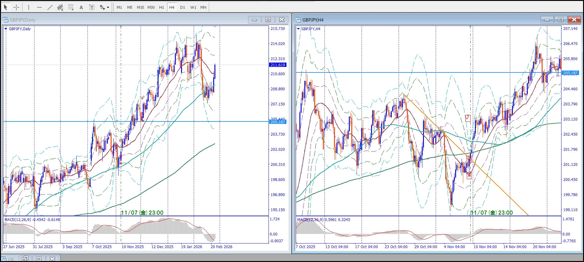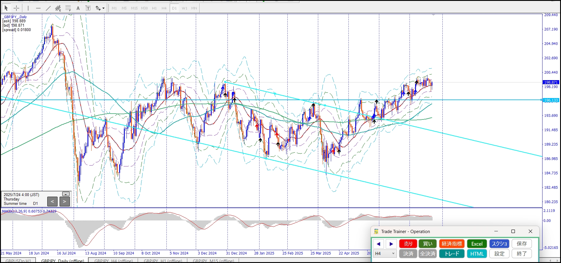 4hの20maでの押し戻り待ってると、ライン切って一気に伸びちゃうパターン多し。入り逃す。